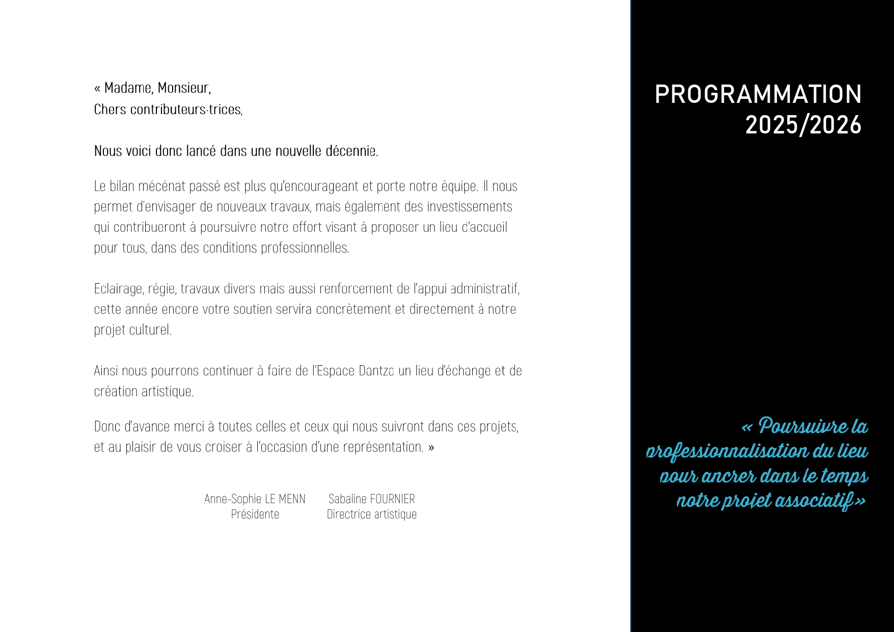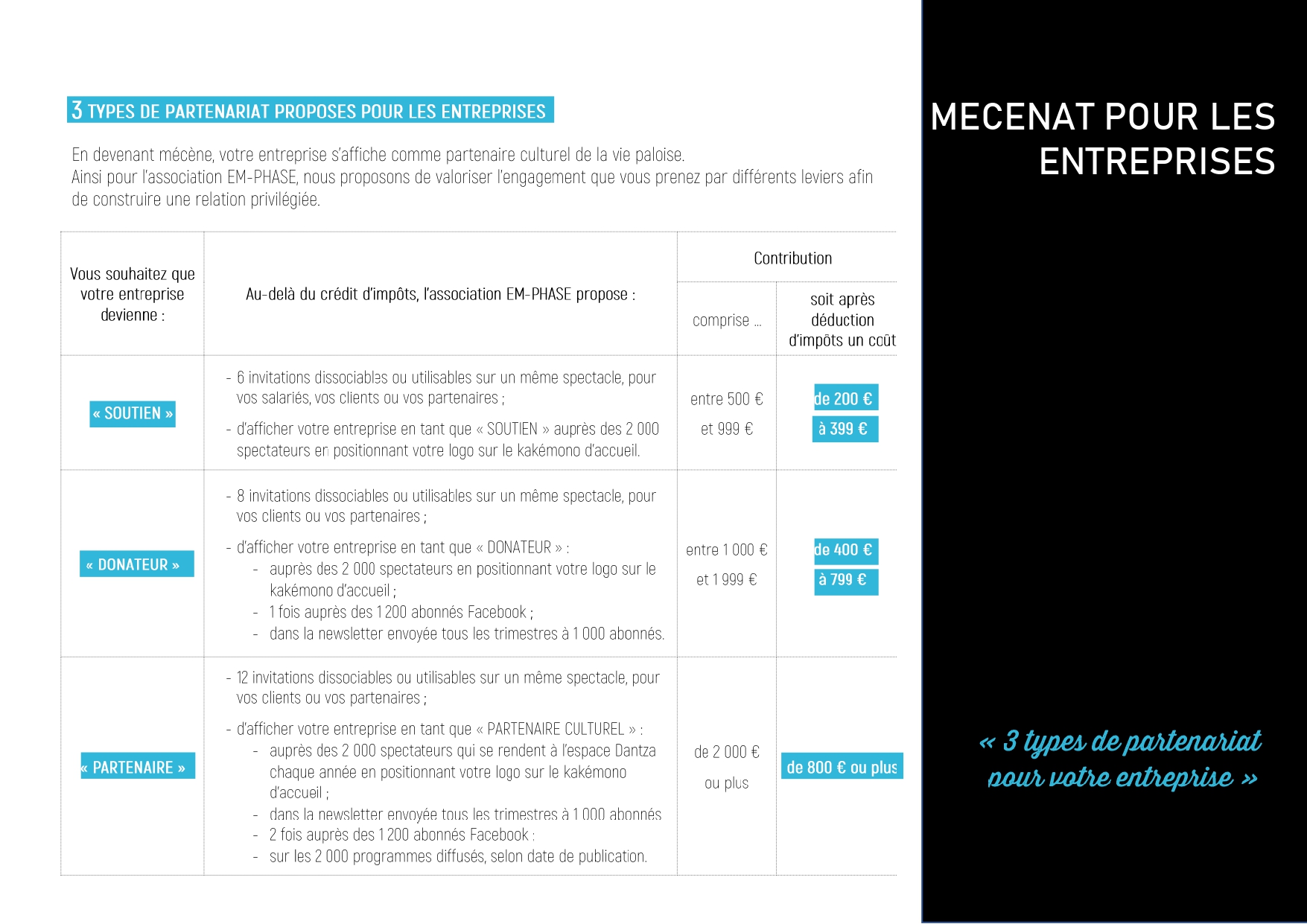 En tant que particulier ou qu'entreprise, vous pouvez soutenir cette activité culturelle en devenant mécène de l'association, tout don ouvrant à un crédit d'impôt de 66 % pour les particuliers, et de 60 % pour les entreprises. Une attestation fiscale vous sera remise, et nous serons également heureuses de vous offrir des invitations aux spectacles de la programmation de cette saison.