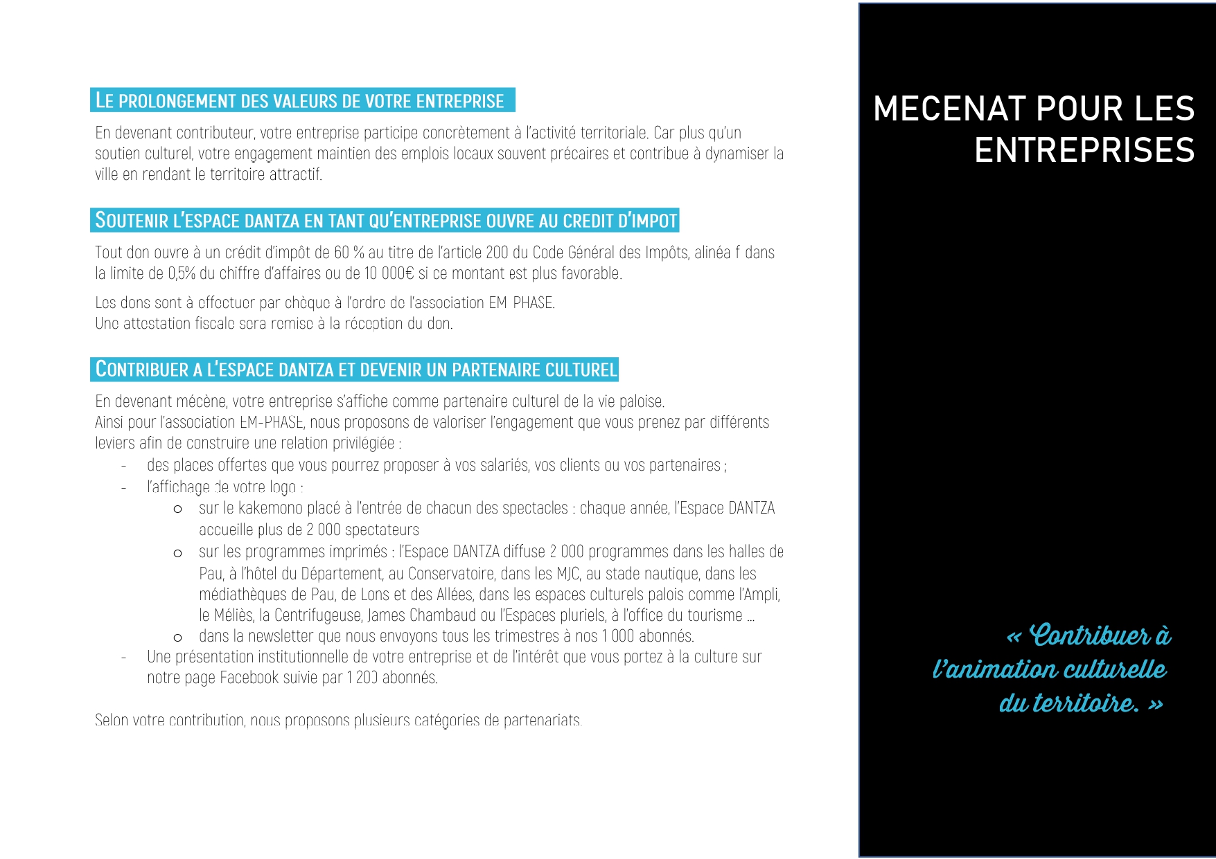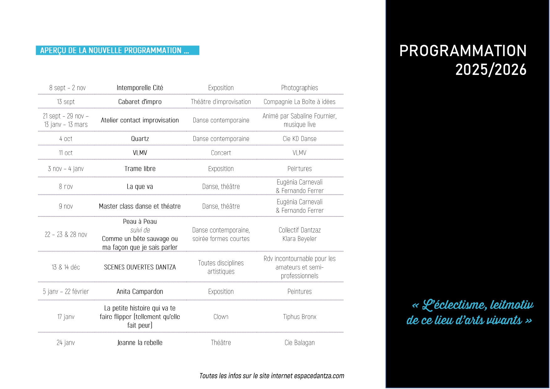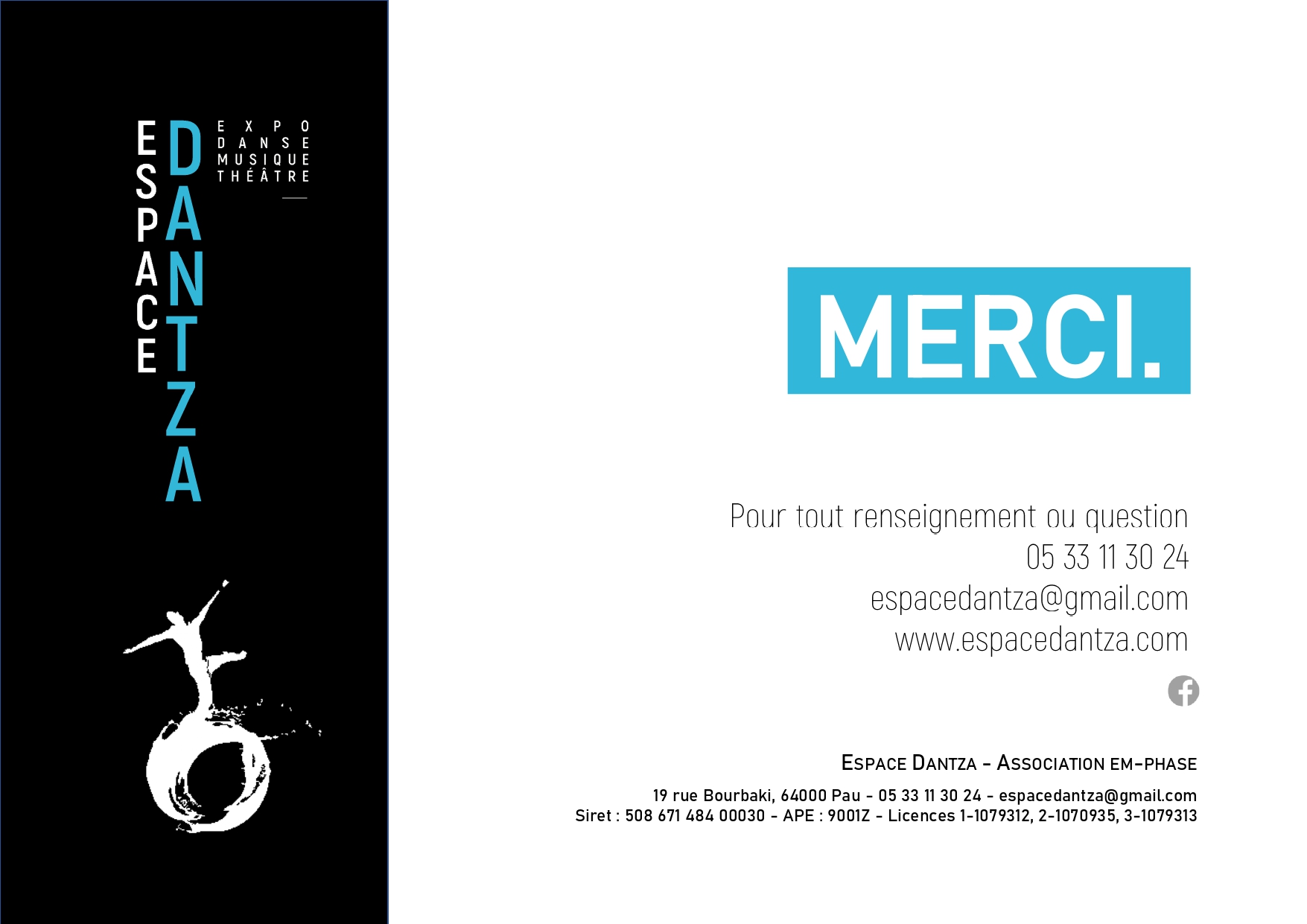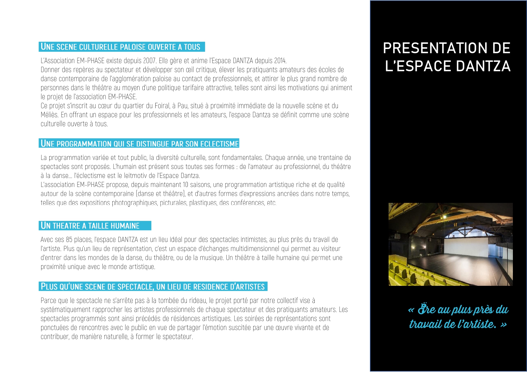 L’Espace DANTZA, lieu de diffusion et de programmation de spectacles vivants, est géré par l’association Em-phase, qui a pour but d’offrir une programmation diversifiée, originale et hors des sentiers battus, afin que chacun puisse avoir accès à une culture alternative et stimulante dans les domaines de la musique, de la danse, du théâtre, du cirque...